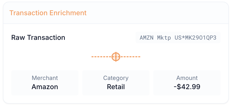 Raw transaction data is processed and enriched with merchant, category, and location information.