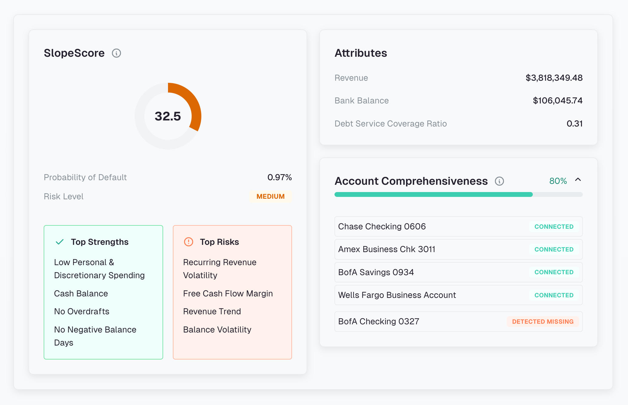 The first SMB-specific cashflow risk score with credit-grade accuracy. Slope Score works alongside (not instead of) FICO/Bureau data.