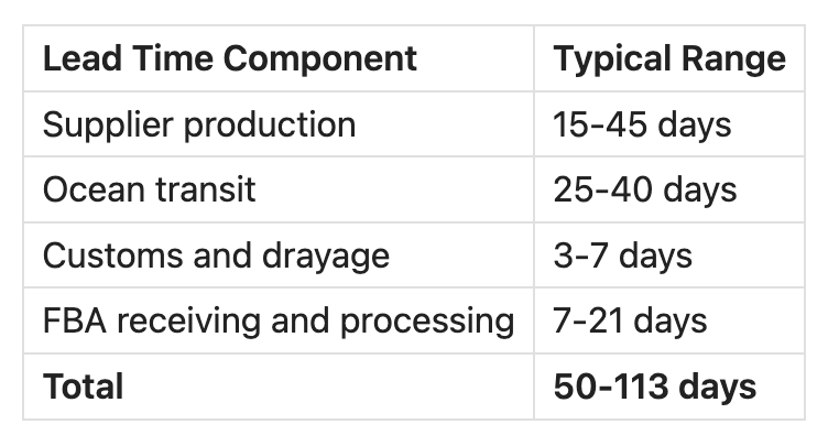 Step 1: Calculate your true total lead time. The full timeline from order placement to inventory available for sale in FBA. Include production, ocean transit, customs, last-mile delivery to FBA, and Amazon's receiving process. For most overseas-sourced products, this is 50 to 113 days.