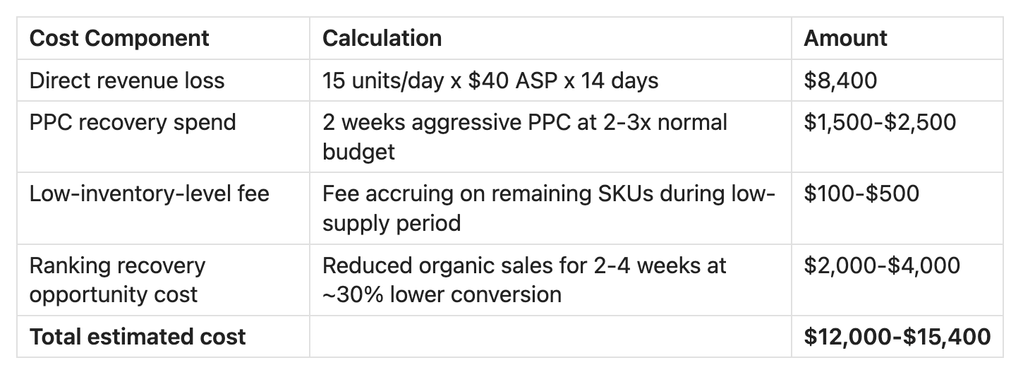 The total cost includes direct revenue loss, PPC recovery spend, low-inventory-level fees, and ranking recovery opportunity cost. For a product selling 15 units per day at $40 ASP, a two-week stockout costs approximately $12,000 to $15,000. The industry average across 240 sellers surveyed by Trellis was $18,000 per stockout event.